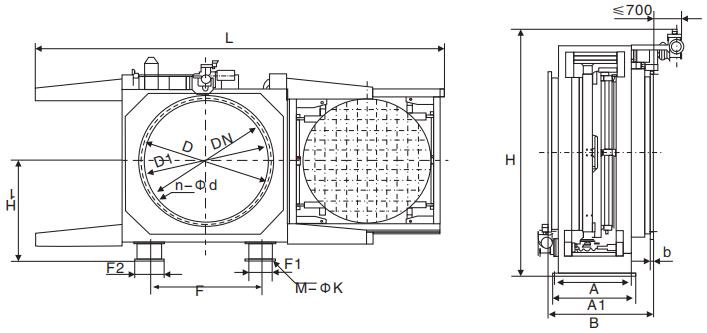 DN | D | D1 | B | b | nd | H | H1 | L | A | A1 | F | F1 | F2 | MK | Electric power (kw) | Quality (kg) | ||||