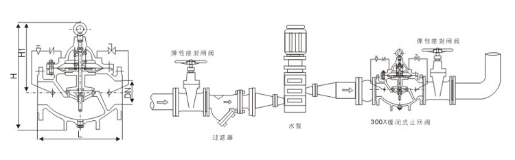 當從進口端給水時,水通過微型過濾器、針閥、單向閥進入主閥控制室,再經過球閥排水至下游。因為針閥開度小于球閥開度,即主閥控制室的排水速度大于進水速度,因此控制室壓力降低,作用于主閥盤下端的進口壓力打開主閥向下游供水。 當管道停止供水時,若下游水開始回流,一部分回流水經球閥進入主控制室,由于單向閥作用,回流水不能從主控制室流出,引起主控制室逐漸升壓,緩緩關閉主閥。