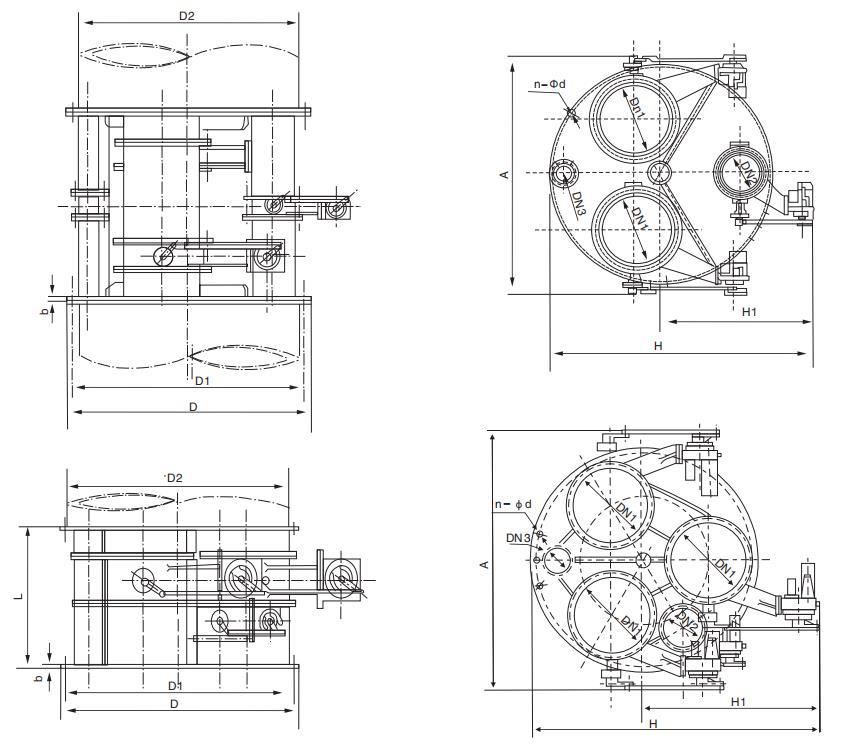 型號 | D | D1 | L | b | n-Φd | A | A1 | Η | H1 | 閥門配制 | 許用流量(m3/h) | 重量(kg) | 對應(yīng) 管道 |